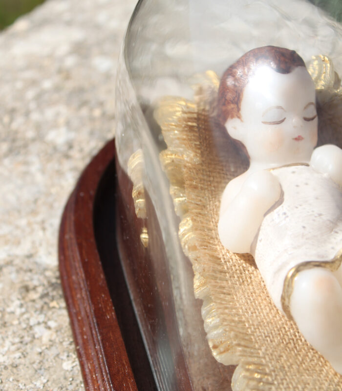 Bambinello custodito in una campana di vetro con occhi chiusi,  mani chiuse e culla in cera dipinto a mano nel Monastero Santa Chiara di Rieti. La cera, una sostanza apparentemente ordinaria, racchiude in sé il potere di trasformarsi in un mezzo affascinante per l’espressione artistica e spirituale consentendo la realizzazione di questo Bambinello che trasmette pace e serenità. E’ una idea regalo per le persone che ami.