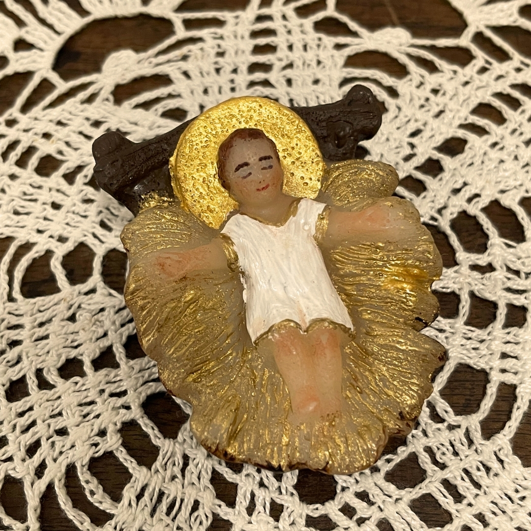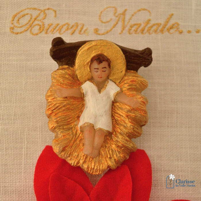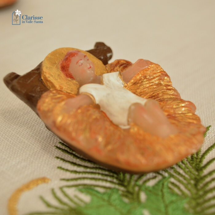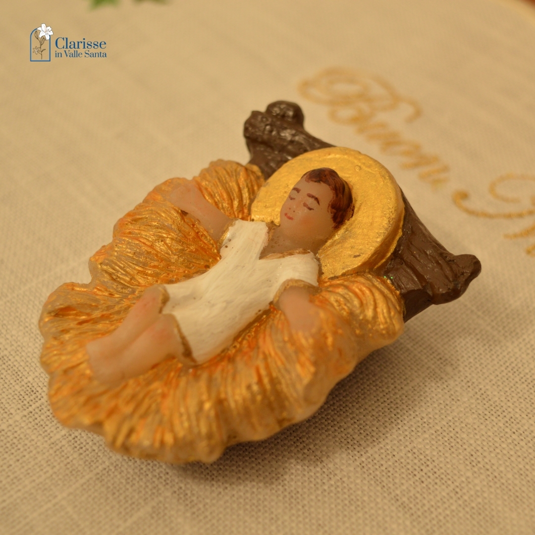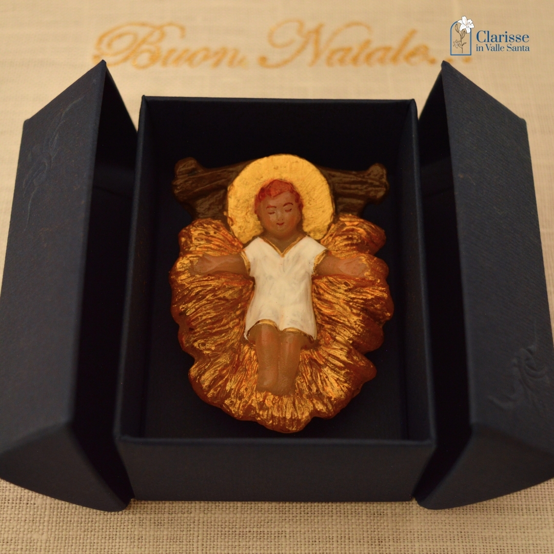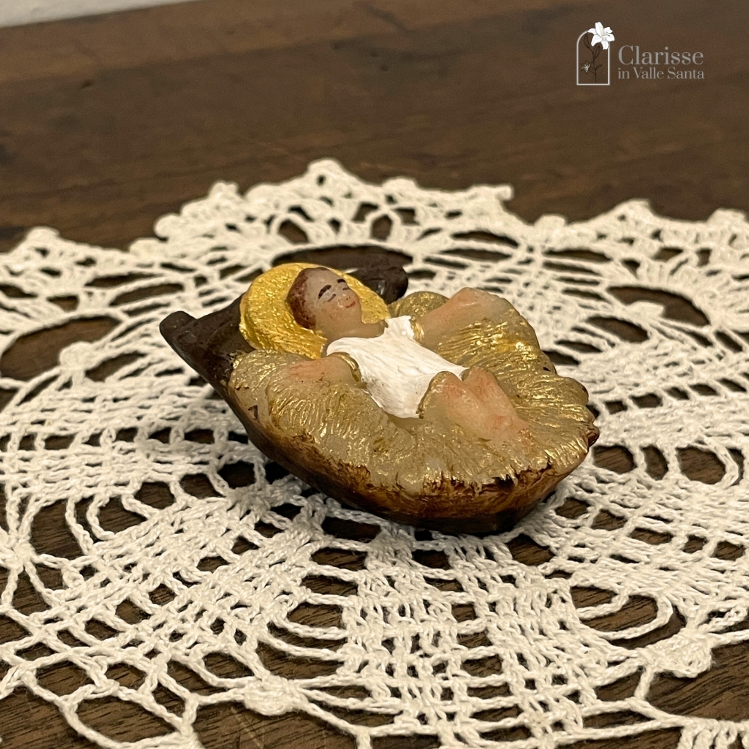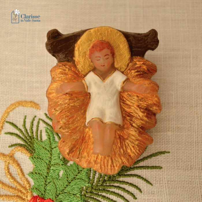 Bambinello con aureola in cera dipinto a mano dalle monache clarisse che proseguendo l’antica tradizione del Monastero, lavorano la cera per creare oggetti che possano trasmettere messaggi di pace, di speranza e di amore.