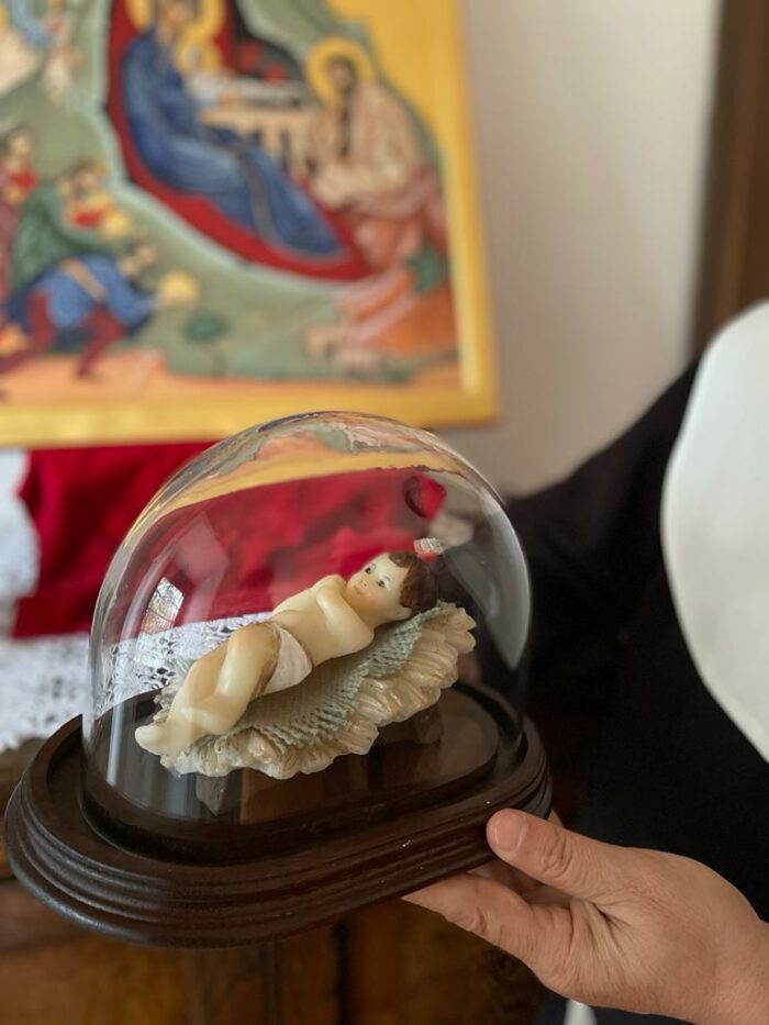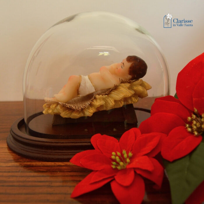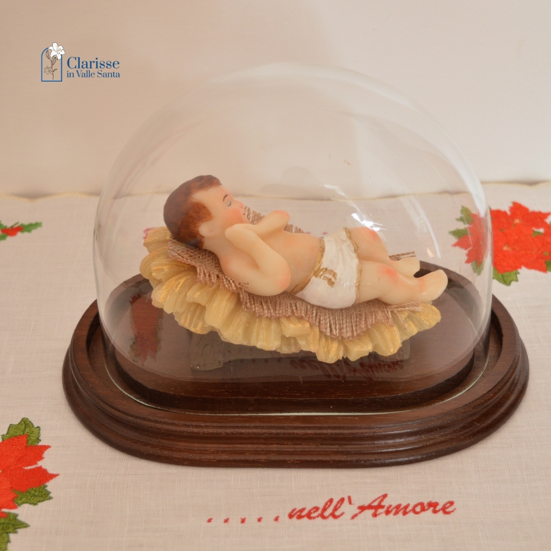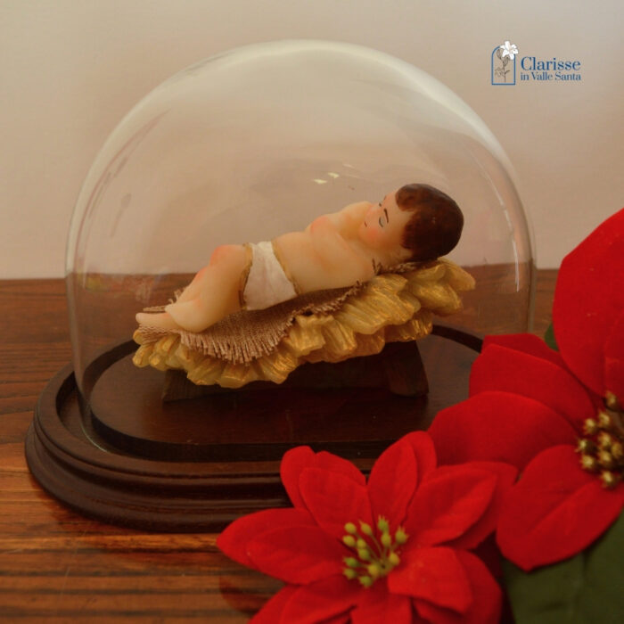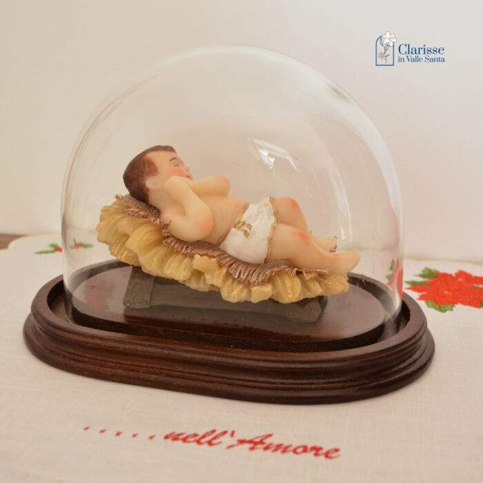 Bambino di Betlemme con occhi chiusi sopra la culla in cera.  E’ collocato dentro una campana di vetro con base in legno che esalta la preziosità del Bambinello completamente realizzato in cera, dipinto a mano con un procedimento artistico che appartiene alla tradizione del Monastero delle Clarisse in Valle Santa.