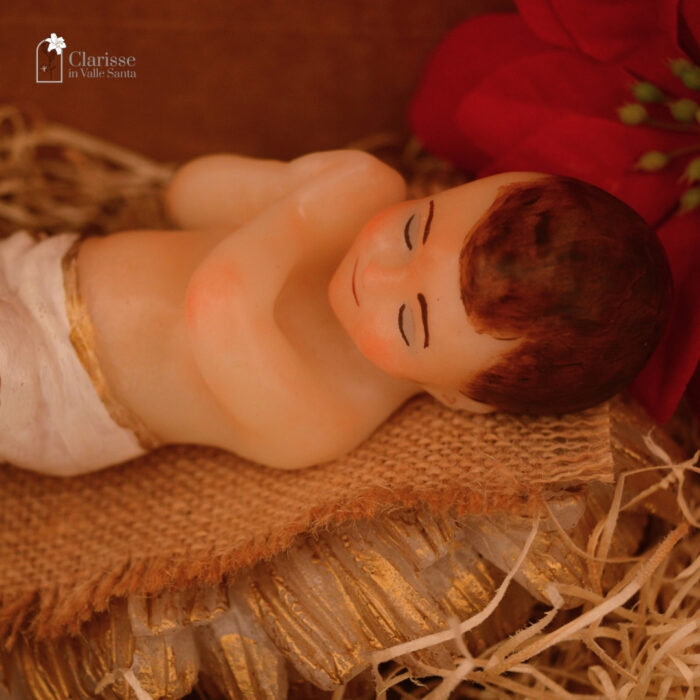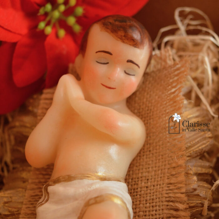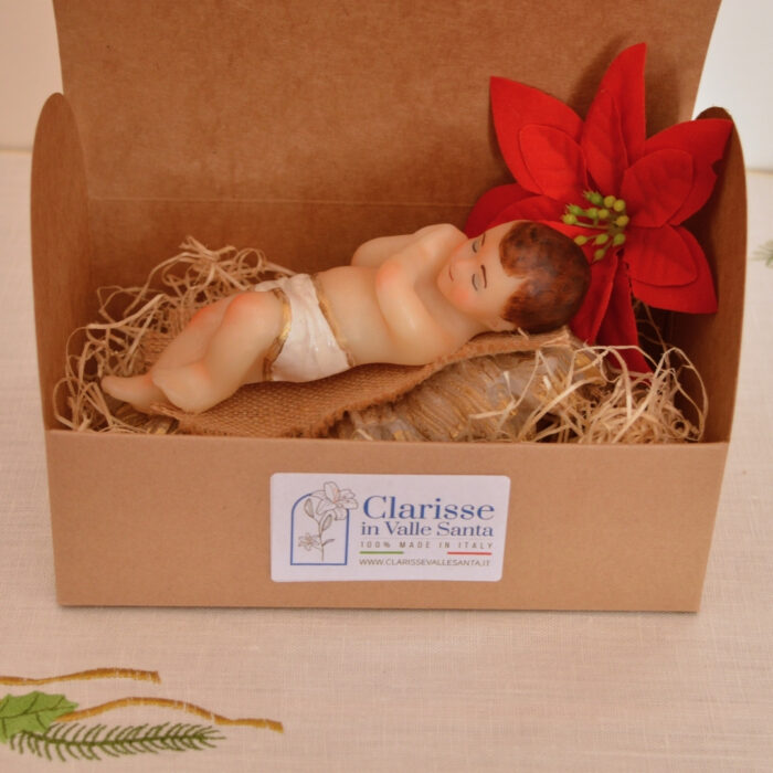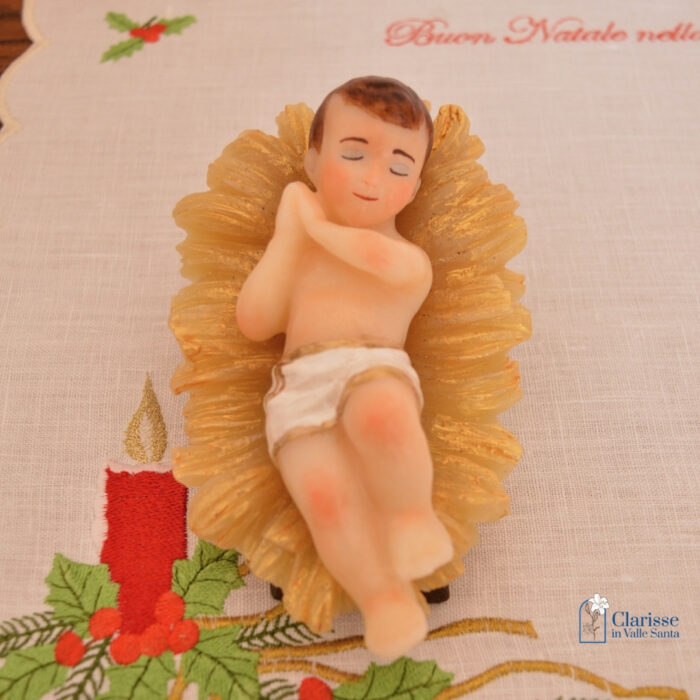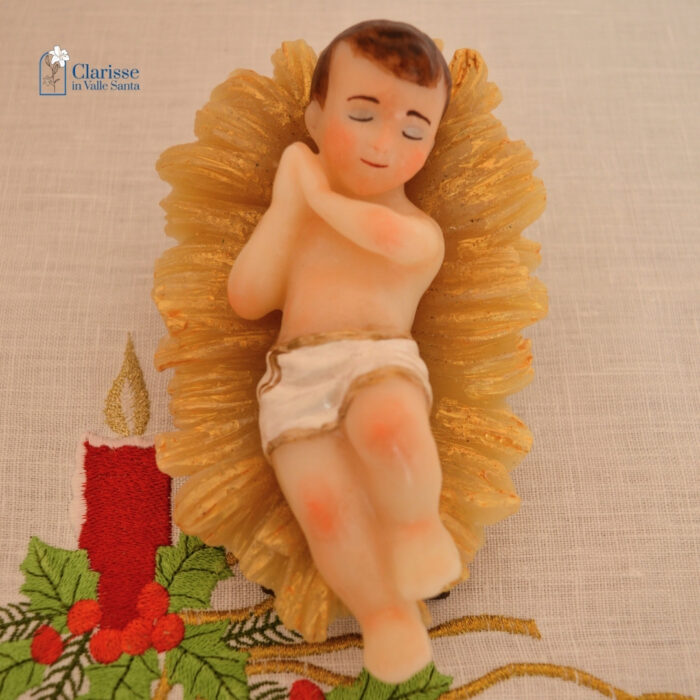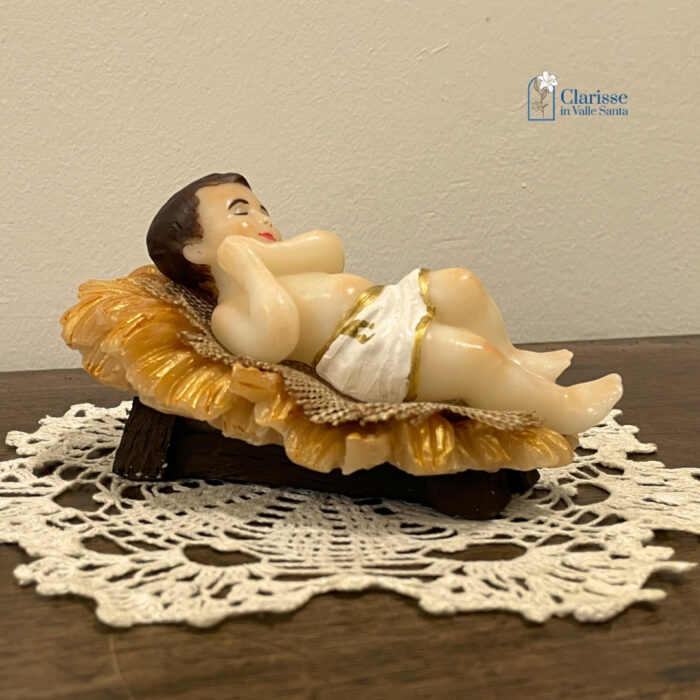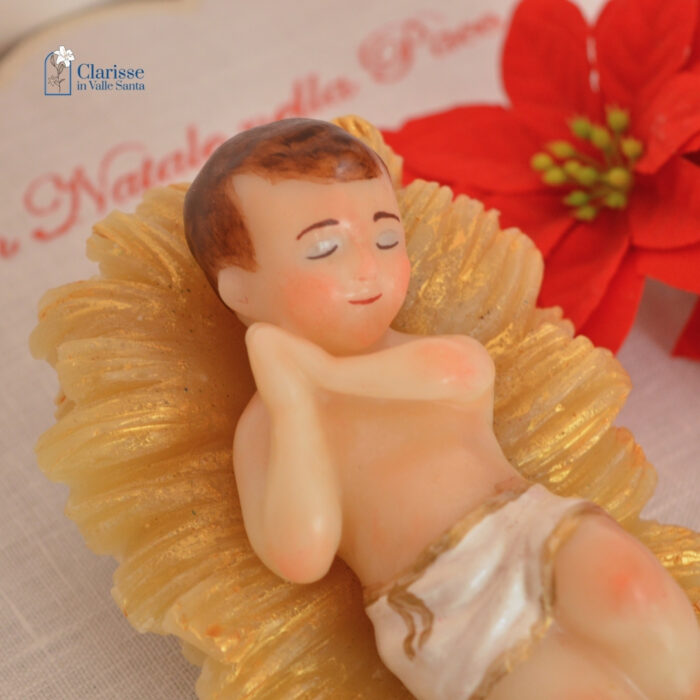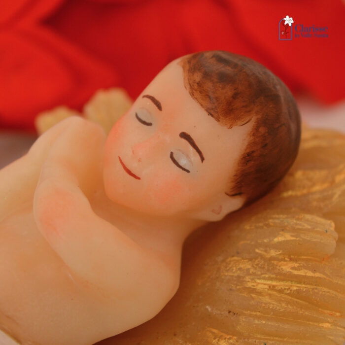 Bambino di Betlemme con occhi chiusi, culla in cera, dipinto a mano  realizzato  dalle monache clarisse. La duttilità della cera, passando attraverso fasi articolate di lavorazione, permette di plasmare questo bambinello che riproduce quello di Betlemme. E’ un dono perfetto per rinnovare il segno della presenza e della benedizione di Dio nelle case delle persone care.
